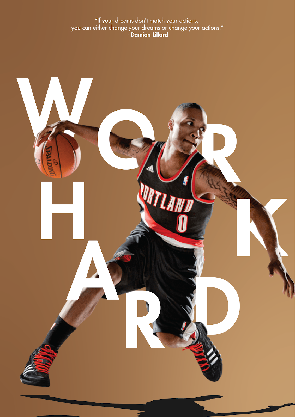 After spending some time to think about the positioning of type, experiment with a variety of background colors, I finally found the optimal color for this composition, a gradient of light and dark brown-gold. I wrapped the type around different parts of the body and arranged them in a direction where the "work" can be quickly read without much effort; The placement of "hard" was to represent the movement of a basketball where the type falls from upper left and bounces up to the right. A quick shadow was then added to give the image less of a flat composition. Finally, to balance the visual weight, I added texts on the top part of the artboard (a quote from Lillard, the basketball player in the image).